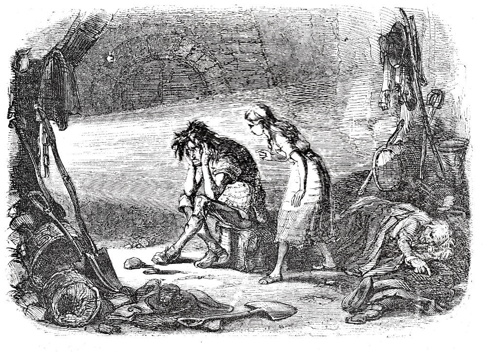 Around Chapter 43/44, Little Nell ends up in a townscape ravaged by overindustrialisation, poverty and riots. Wandering late, they eventually come across a ghostly, gaunt figure who invites them to stay in his workhouse. Despite the continuous racket of hammers (even late into the night) and the uncomfortable bedding, they oblige.