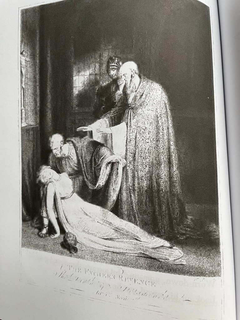 Though you cannot call me a theatre kid and I cannot stand poetry, I was struck by a whim to read the play when I saw it. I had a stroke of luck at Waterstones; turns out there were more copies in circulation than you’d expect! The collection I found, printed by the preservational Hustree Press – the frontispiece references an 1800 edition published by William Bulmer. It even comes with some nifty illustrations: I sadly cannot determine the artists name due to the illegibility of captions.