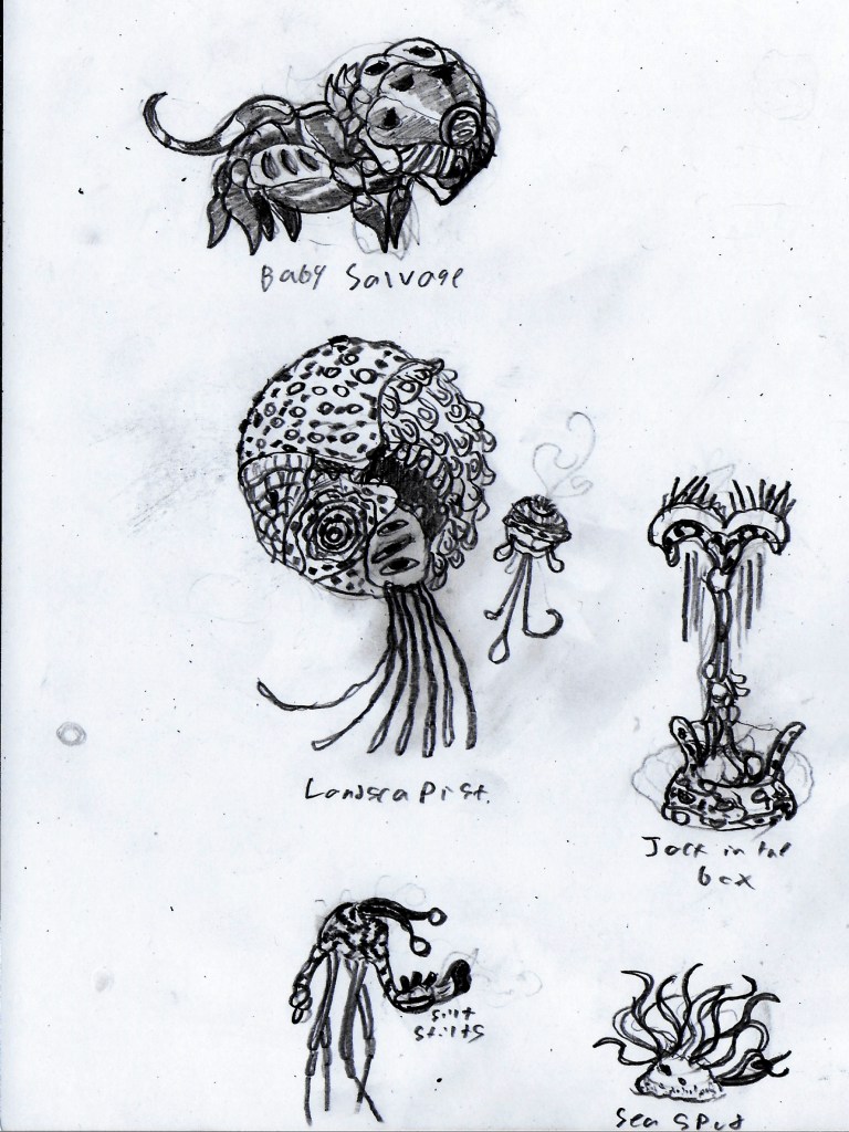 Bizarre alien specimens, plus the artist’s sub-standard handwriting. (Translation: “Landscapist” + “Jack in the box” (top left and right), “Silt stilts” + “Sea spud” (Bottom left + right).